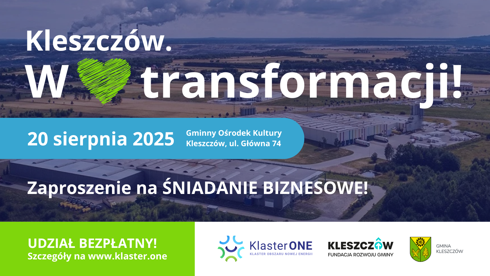Szanowni Państwo, w imieniu organizatorów cyklu wydarzeń „Kleszczów. W 💚 transformacji!”, mamy przyjemność zaprosić Państwa na cykl śniadań biznesowych, które będą kontynuacją i pogłębieniem wspólnych działań na rzecz transformacji społeczno-gospodarczej regionu.