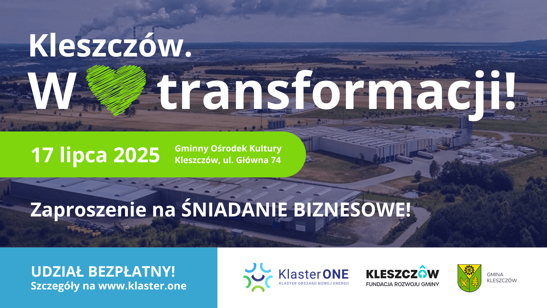 Szanowni Państwo, w imieniu organizatorów cyklu wydarzeń „Kleszczów. W 💚 transformacji!”, mamy przyjemność zaprosić Państwa na cykl śniadań biznesowych, które będą kontynuacją i pogłębieniem wspólnych działań na rzecz transformacji społeczno-gospodarczej regionu.